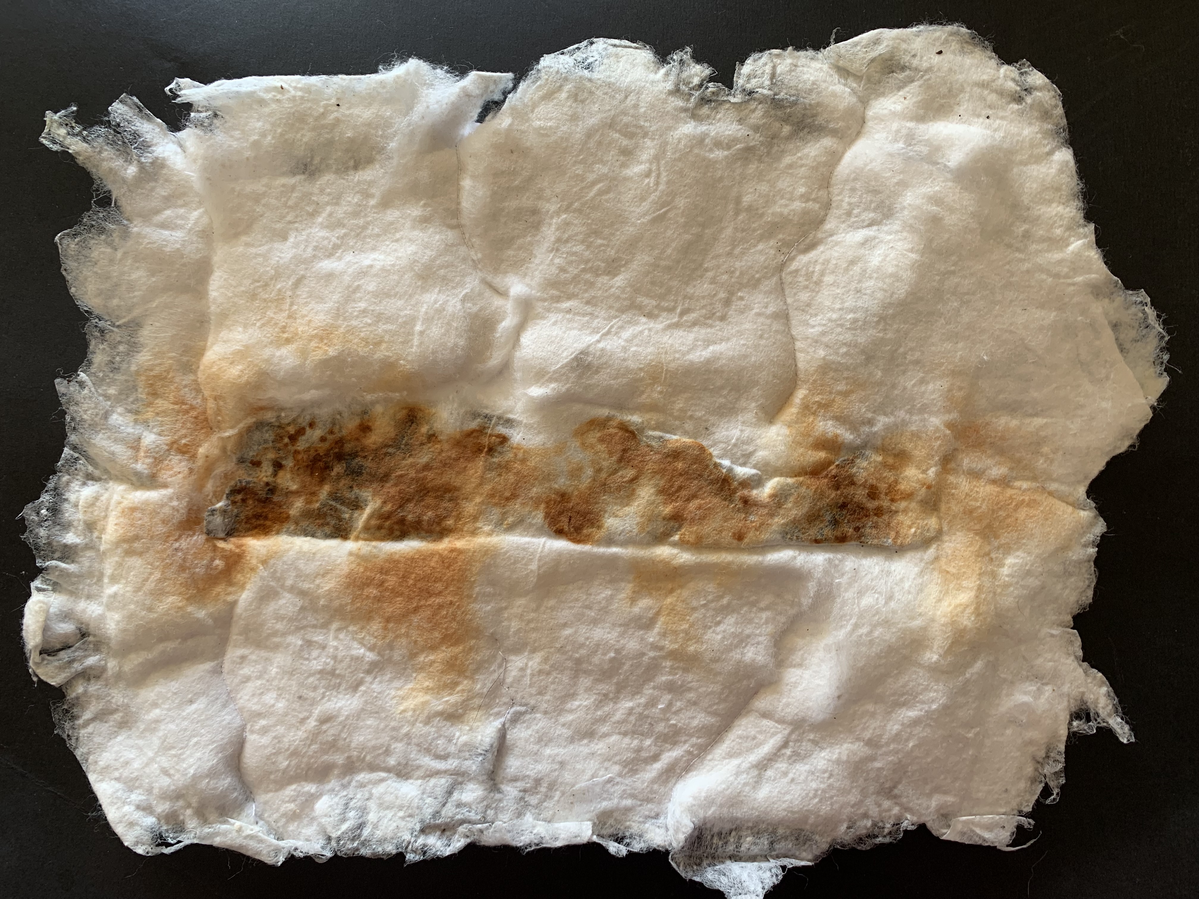 The found object in this work is a rusty piece of metal found at the Blast beach, Seaham. The paper is handmade cotton wool paper.